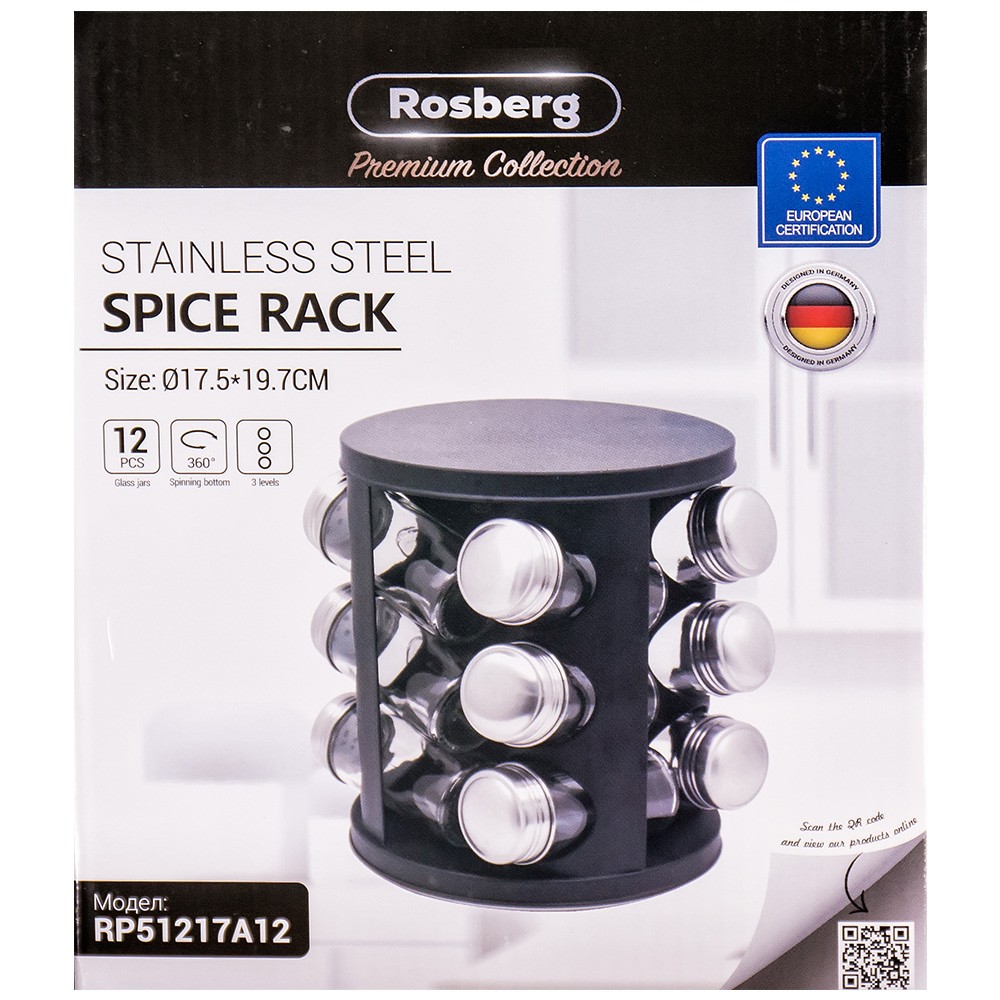Основни характеристики: Бурканчета за подправки на стойка Rosberg RP51217A12, 12бр. бурканчета, Метална поставка, Черен - Код G8670