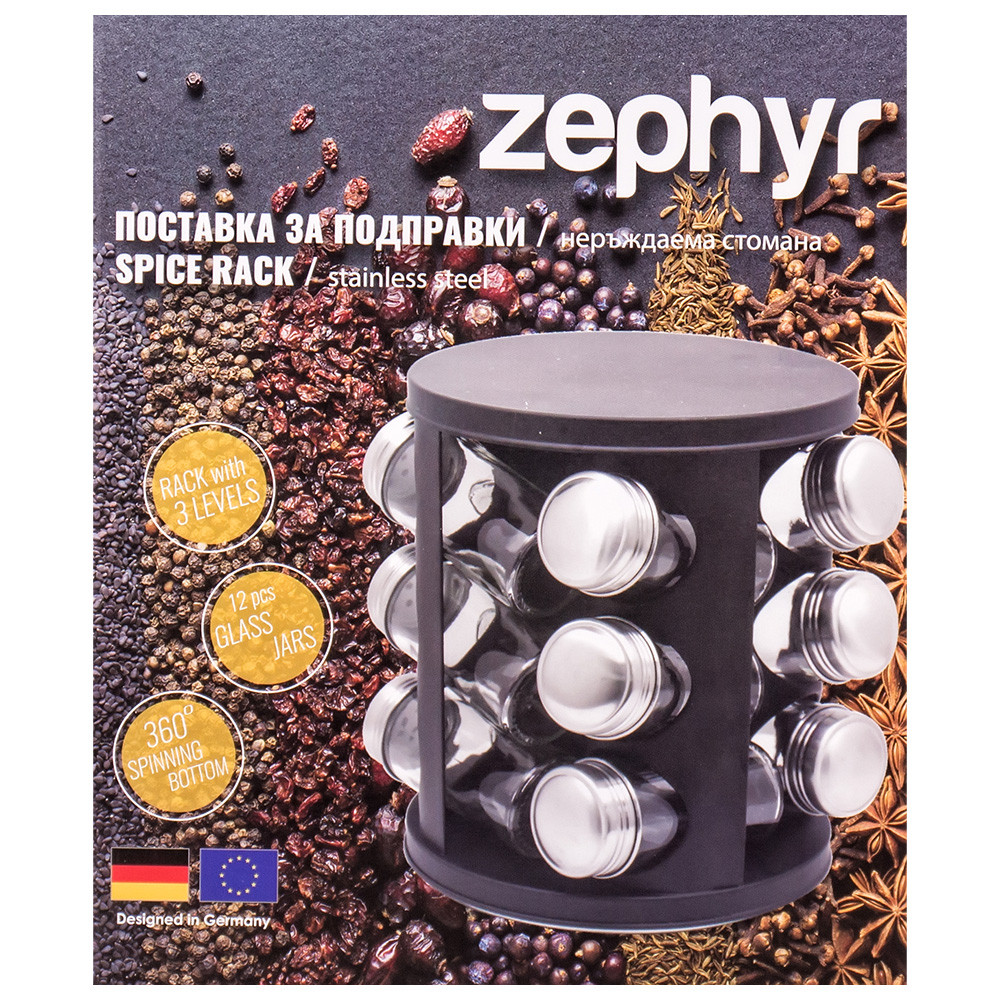 Основни характеристики: Бурканчета за подправки на стойка ZEPHYR ZP 1217 CR12, 12 бр. бурканчета, 3 нива, Въртяща се основа, Черен - Код G8459
