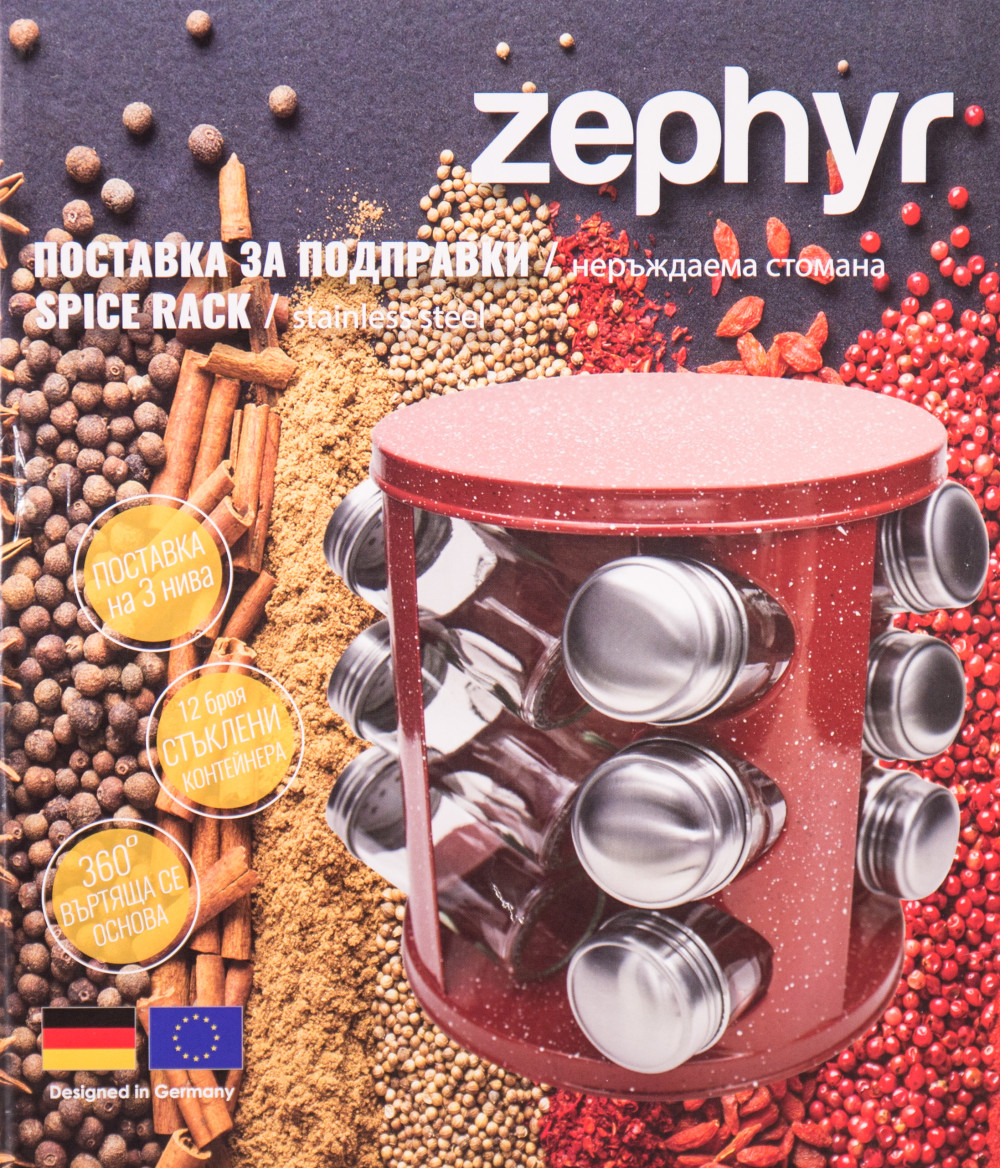 Основни характеристики: Бурканчета за подправки на стойка ZEPHYR ZP 1217 CR12, 12 бр. бурканчета, 3 нива, Въртяща се основа, Червен - Код G8818