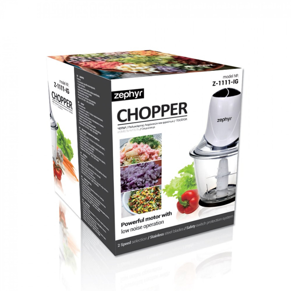 Основни характеристики: Чопър със стъклена купа ZEPHYR ZP 1111 IG, 300W, 1.5 литра, 2 скорости, 4 остриета, Бял - Код G8421