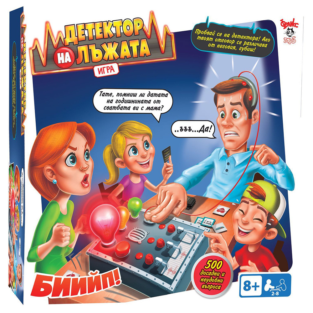 Играта Детектор на лъжата е подходяща за всички членове на семейството, които са на възраст над 8 години, като в нея могат да се включат едновременно от 2 до 8 души. Комплектът съдържа: