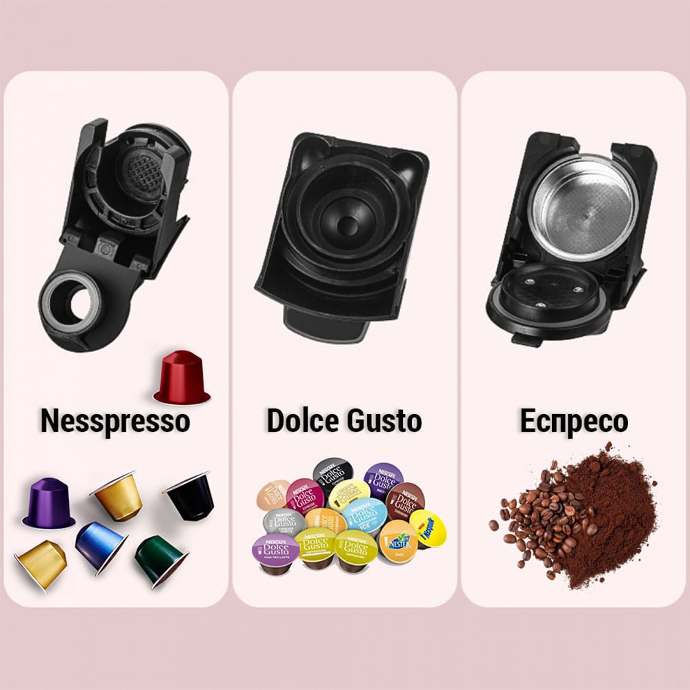 С 3 различни приставки: капсули Долче густо, капсули Неспресо, мляно кафе