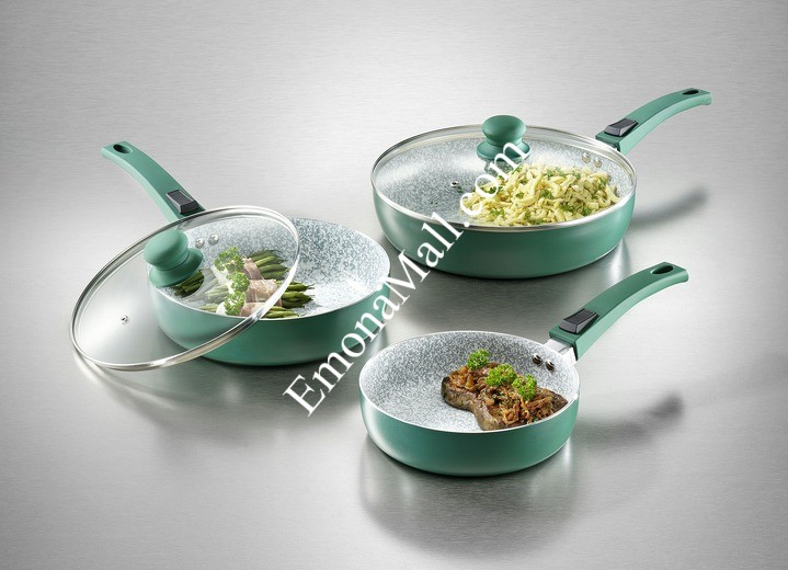 Комплект от алуминиеви тигани с покритие от мрамор. Печете, задушете, яйце, без почти никакви мазнини и масло. Нищо