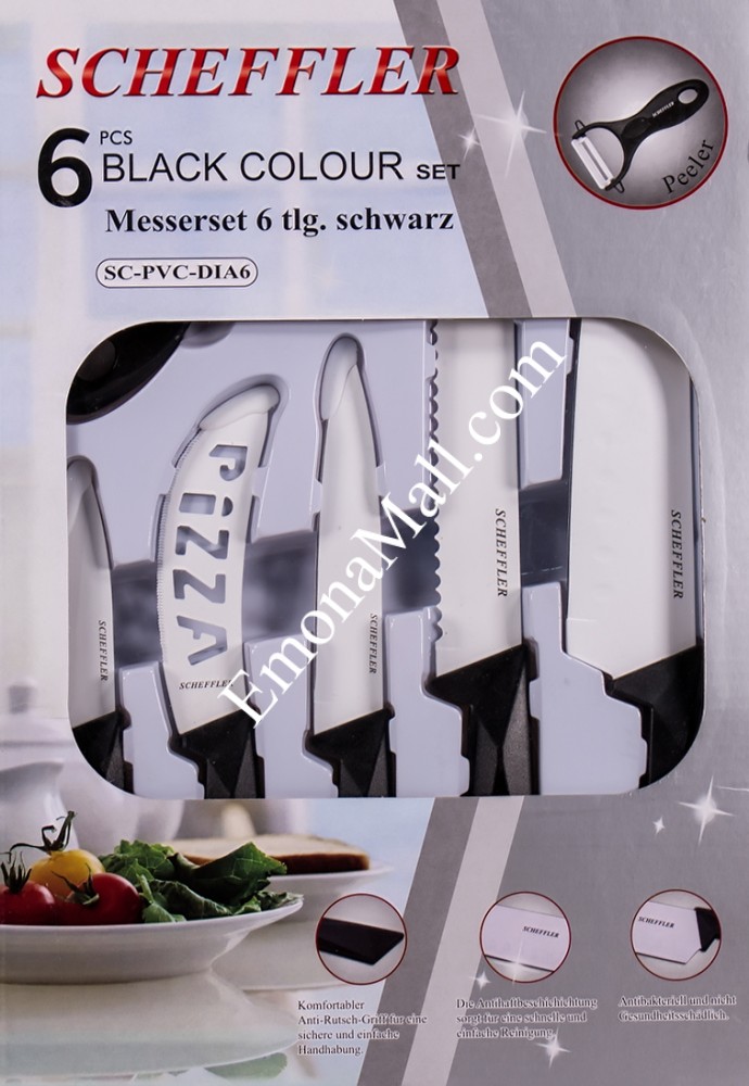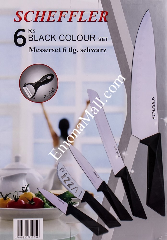 Основни характеристики: Комплект ножове Sheffler (5бр.) + Подарък: Белачка, Черен/Бял - Код G1343