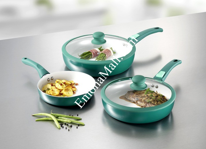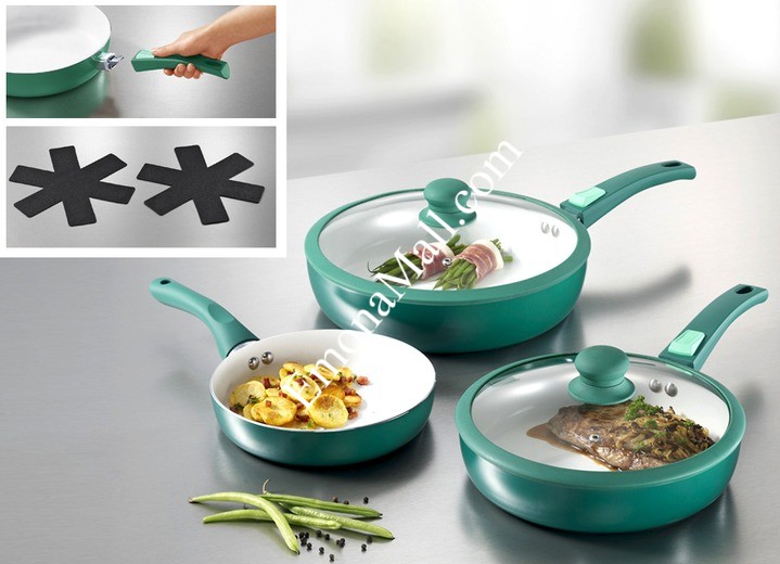 Комплект от 7 части, състоящ се от: 3 тигани: ø 28 cm, H 6,5 cm; ø 24 cm, H 5,5 cm с подвижни дръжки