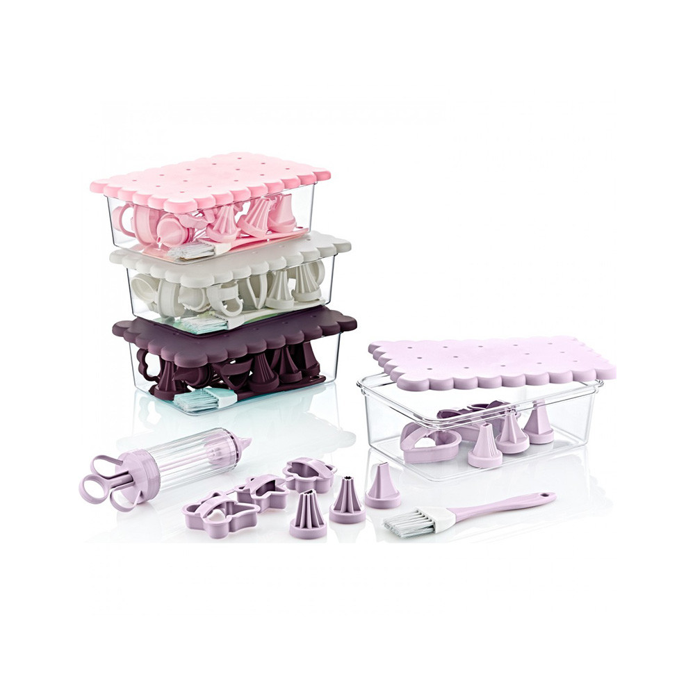 Съдържа: шприц, четка за мазане, 3 различни накрайника за шприца, 3 форми за изерязване и кутия за съхранение.