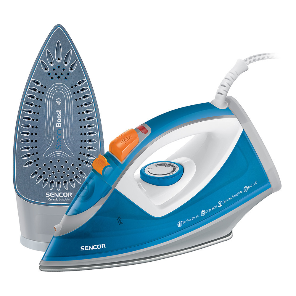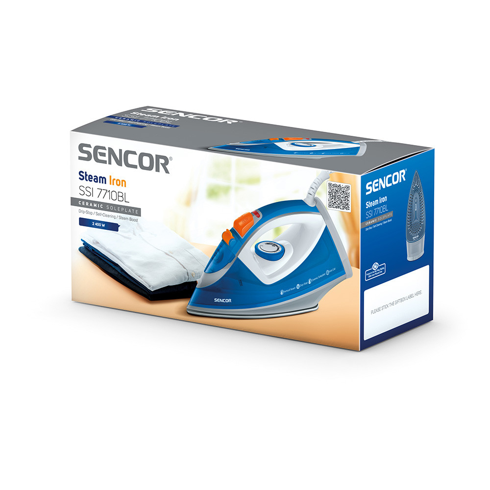 Основни характеристики: Ютия Sencor SSI 7710BL, 2400 W, Керамична плоча, Anti-Calc система, Вертикално гладене, Бял/Син - Код G5217