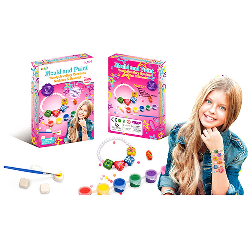 Комплектът съдържа 6 водни боички, четка, пакетче мъниста и 3 гипсови елемента за изработка на гривнички и герданчета.