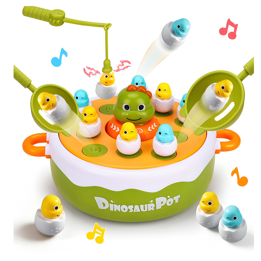 Комплектът включва: 1 въдица, 2 риболовни кепчета, въртящ се музикален риболовен басейн, 1 голяма количка с динозавър - фрикционна (на принципа на засилването) и 10 малки динозавъра.