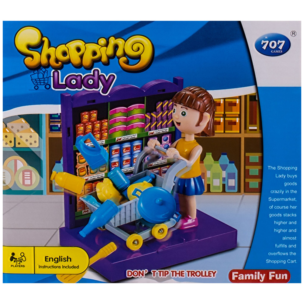 Комплектът съдържа 1 пазаруваща дама, 1 количка за пазаруване, зарче, платформа с макети на рафтове, продукти и предмети за пазаруване.