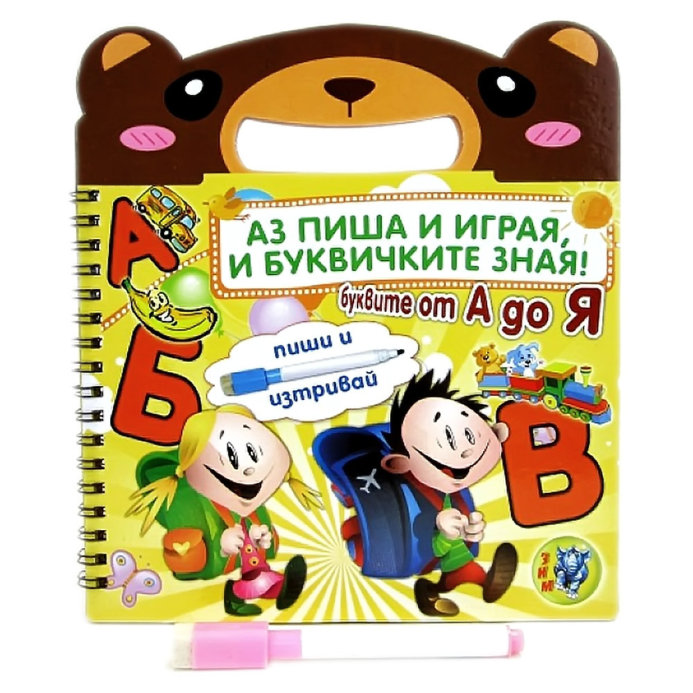 Комплектът съдържа детска картонена книжка с картинки, главните и малките букви от българската азбука и флумастер с изтриваща част.
