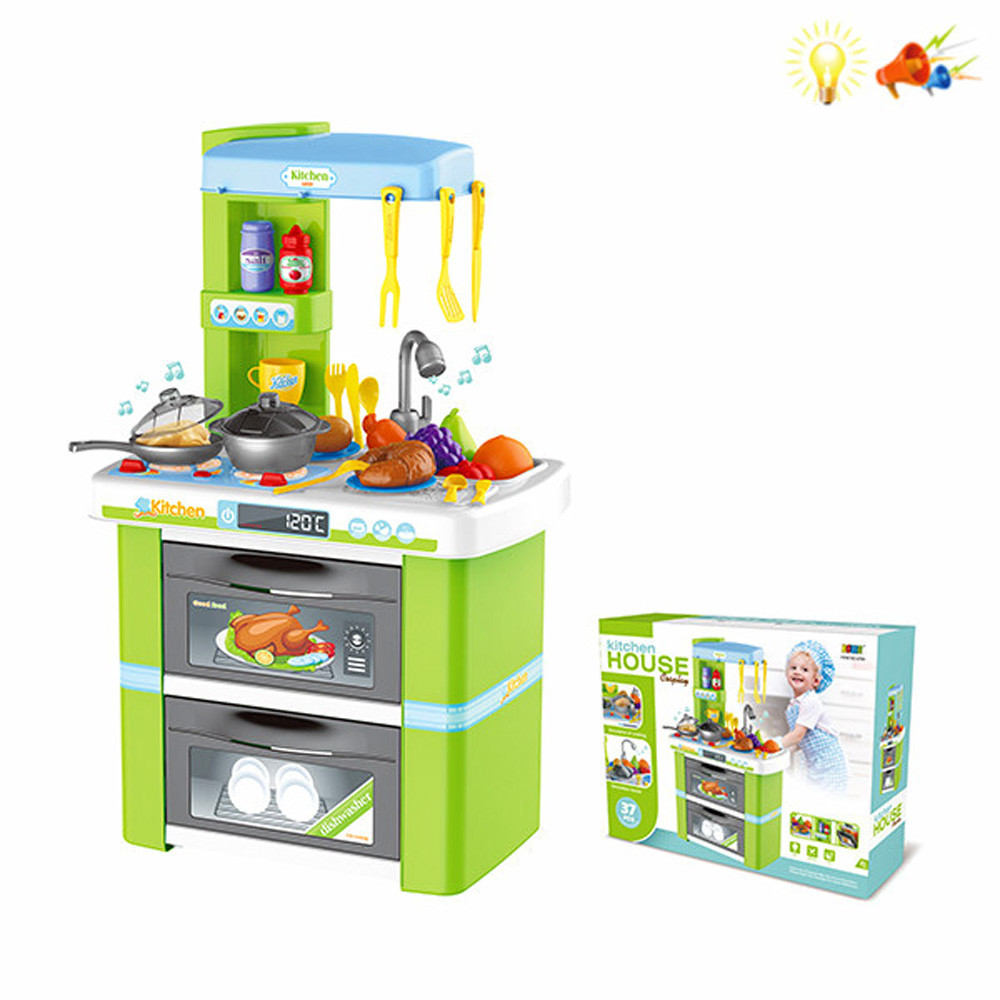 Комплектът съдържа сглобяема кухня с мивка и два котлона, съдове и прибори за готвене и хранене и макети на хранителни продукти.