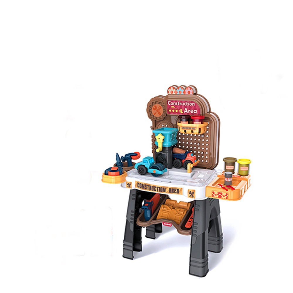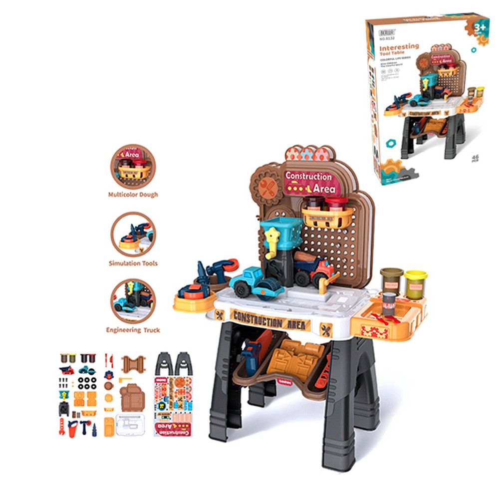 Комплектът съдържа сглобяема работна маса с инструменти (отвертка, ключ, трион-преса), 4 цвята моделин, прибори и форми за моделиране, камион валяк, камион самосвал и ръчна мелница за моделин.