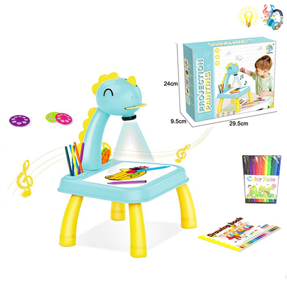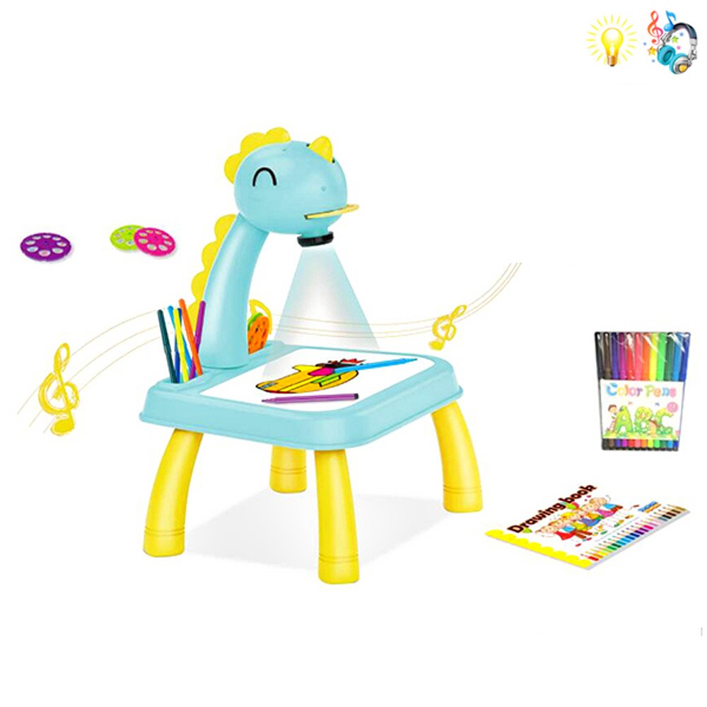 Комплектът съдържа масичка, проектор с лампичка, 3 диска с общо 24 примерни картинки за прерисуване, 12 цветни флумастера и блокче с бели листи.