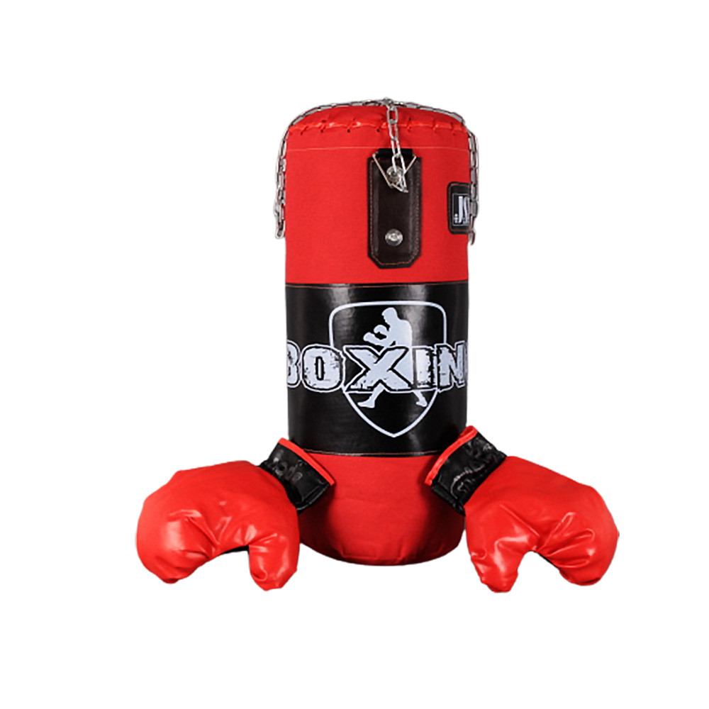 Комплектът съдържа боксова круша от брезент и изкуствена кожа и две ръкавици от изкуствена кожа.