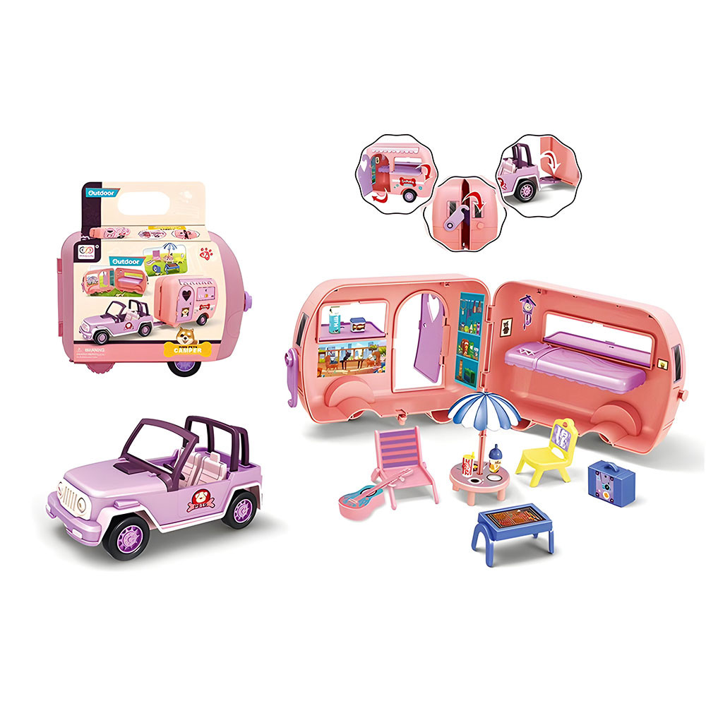 Всички аксесоари и джипът могат да се съхраняват в караваната, което прави играчката удобна за носене навсякъде.