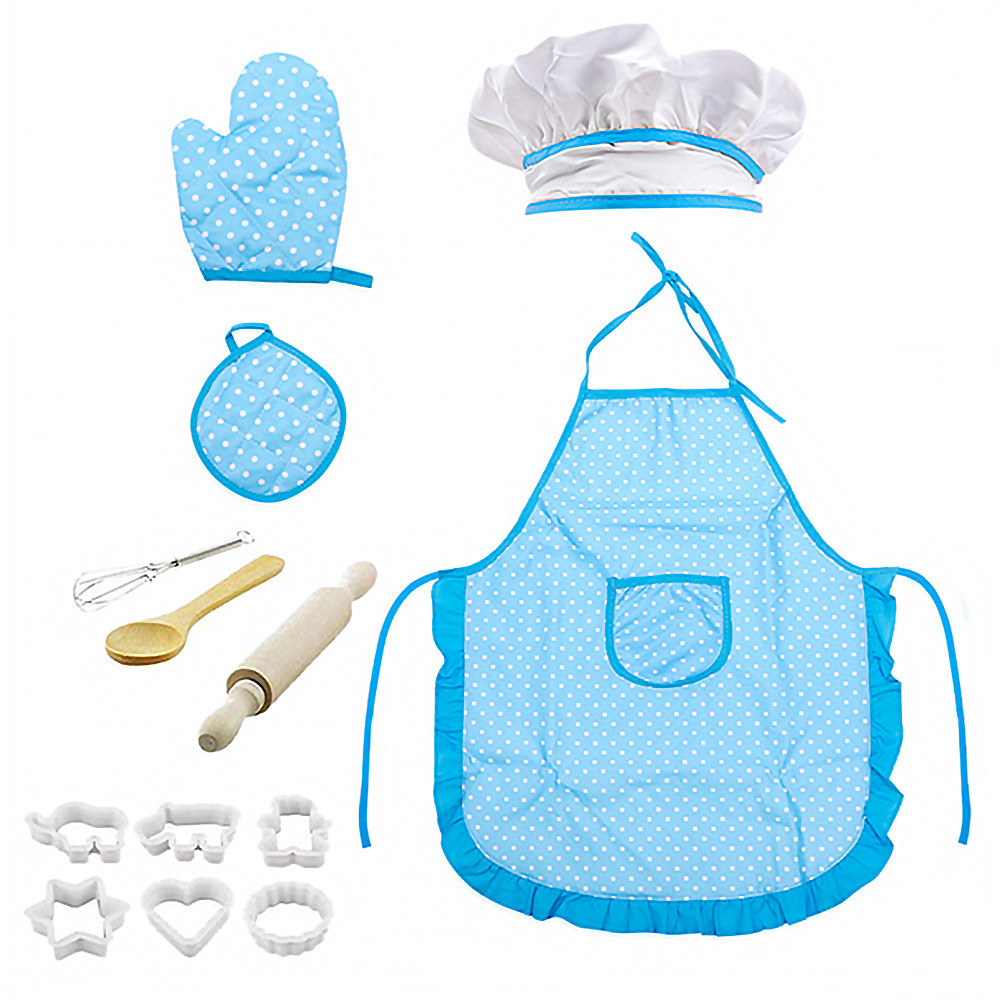 Съдържание: престилка, шапка, ръкавичка, ръкохватка, дървена точилка, дървена лъжица, метална бъркалка, 4 пластмасови формички за сладки или соленки.