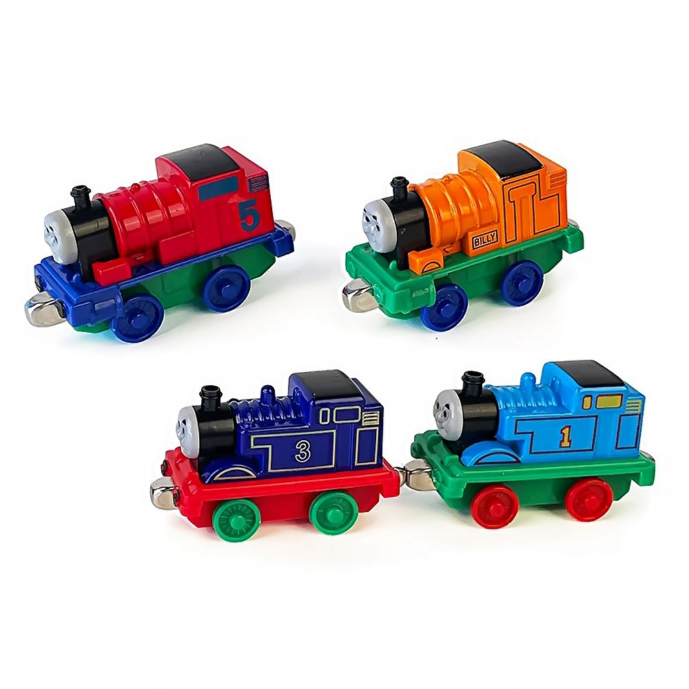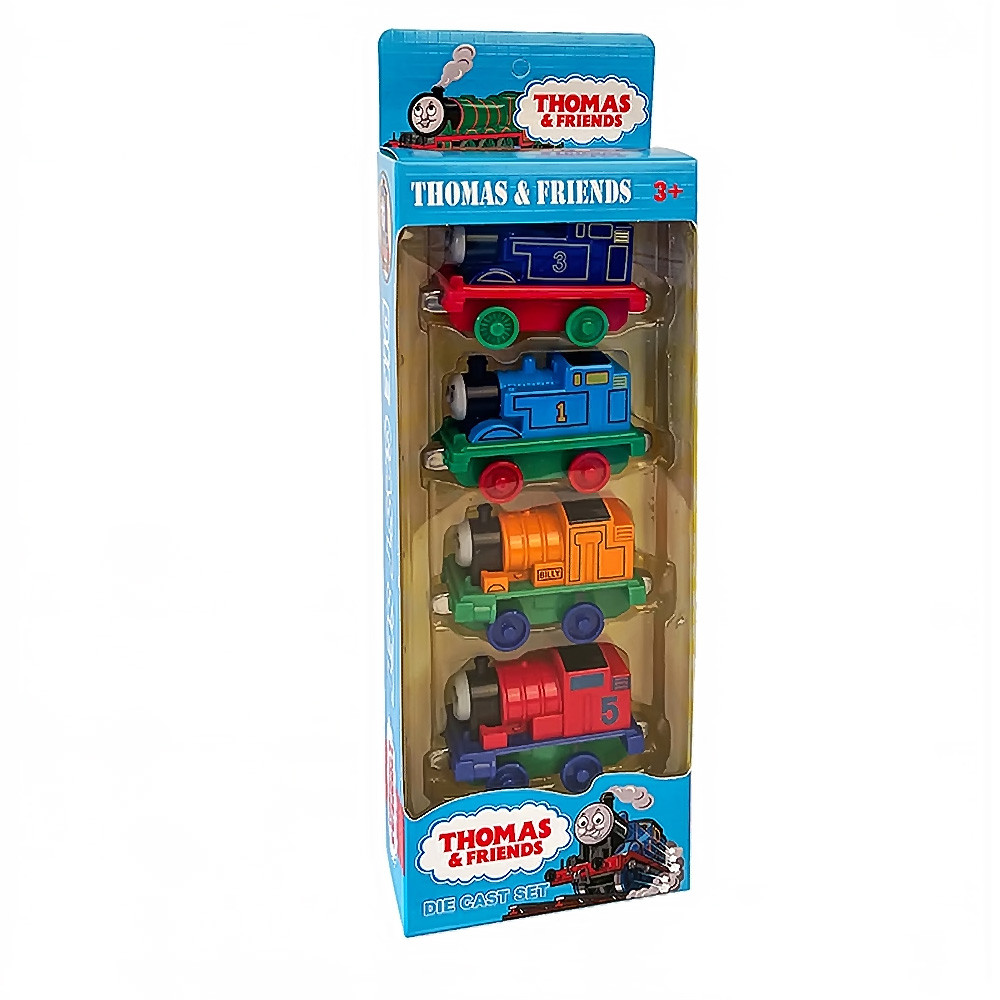 Комплектът съдържа 4 броя метални локомотивчета с пластмасови елементи.