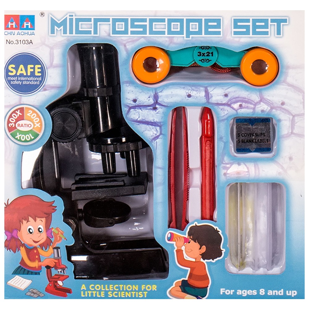 Комплектът съдържа микроскоп, бинокъл и принадлежности (пинсета, шпатула, предметни стъкла, покривни стъкла, празни етикети за надписване на пробите, готова проба от пух на глухарче).