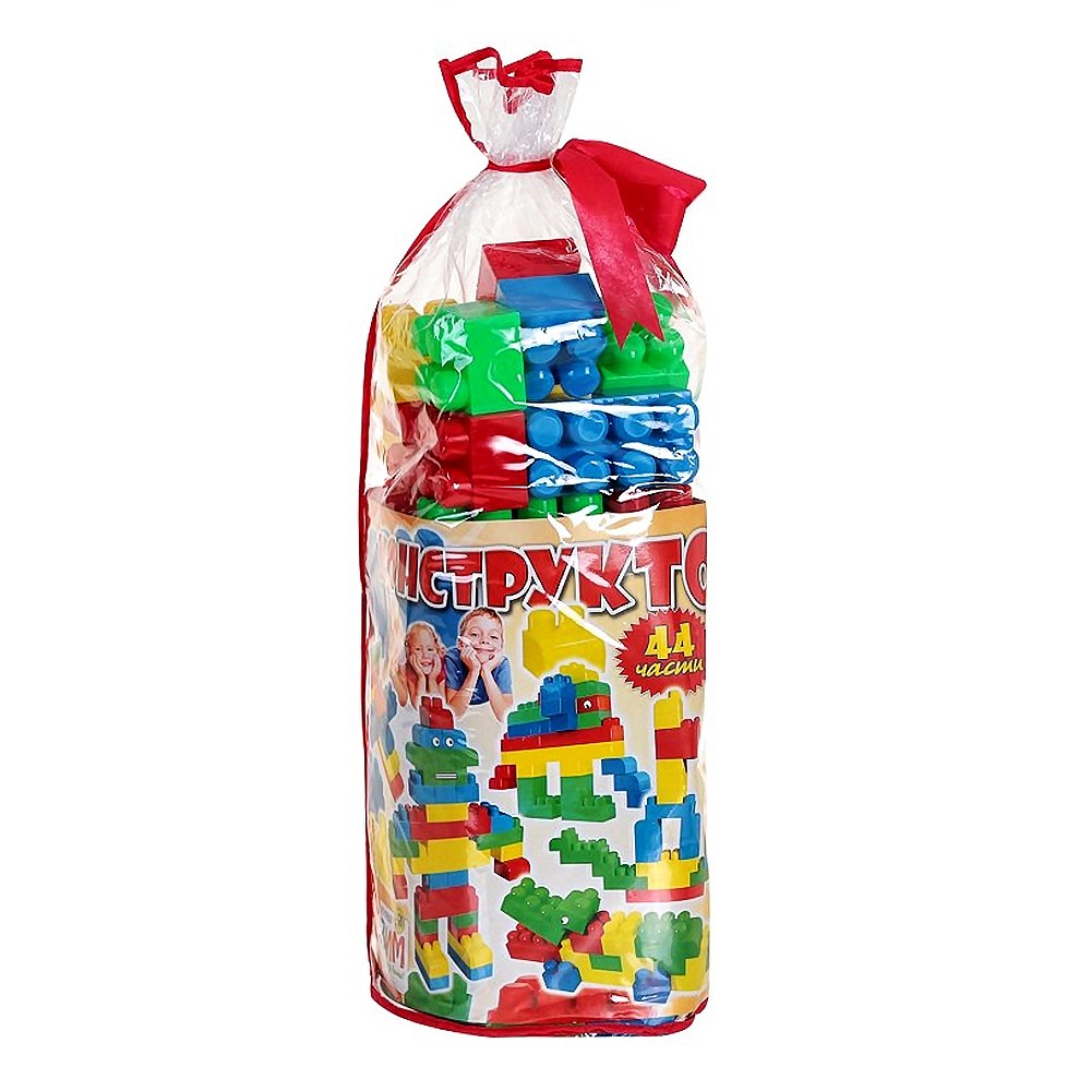Комплектът съдържа 44 части на конструктор и чувалче.