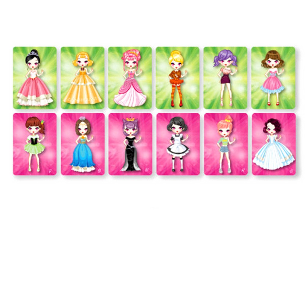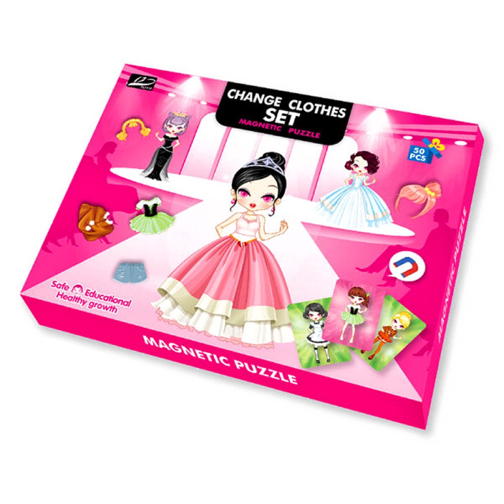 Комплектът съдържа двулицева магнитна дъска, 50 цветни магнитни елемента за подреждане (дрехи, обувки, прически и аксесоари за красота), 12 примерни модела на тоалети за манекенката и флумастер с изтриваща част.
