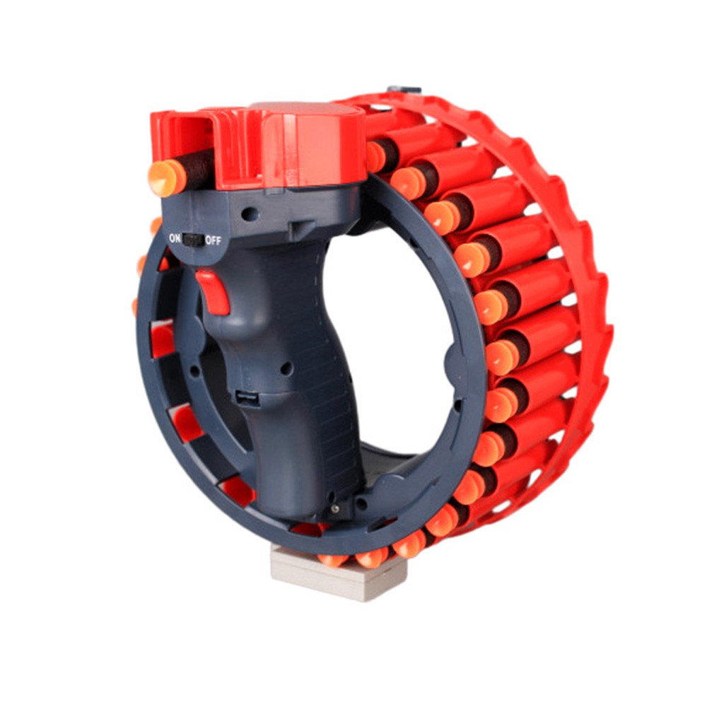 Комплектът съдържа автоматичен пистолет с удобна ръкохватка и държач за 28 стрели, 28 гумени стрели с вакуумни върхове, зареждаща се батерия и USB кабел за зареждане.