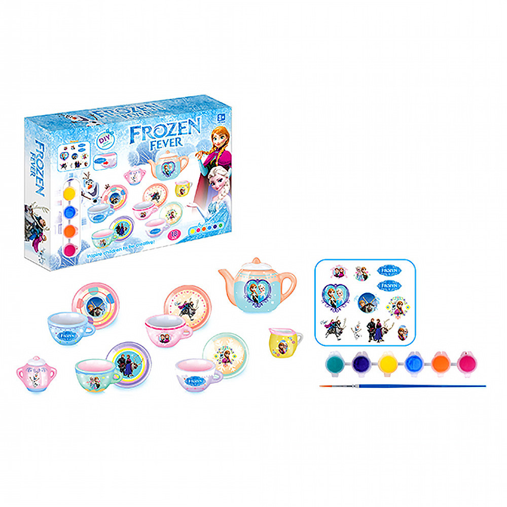 Съдържание: 4 чашки, 4 чинийки, чайник с капак, латиера, захарничка с капак, 6 цветни акварелни боички на водна основа, четка, 11 цветни самозалепващи се стикерчета за декорация.