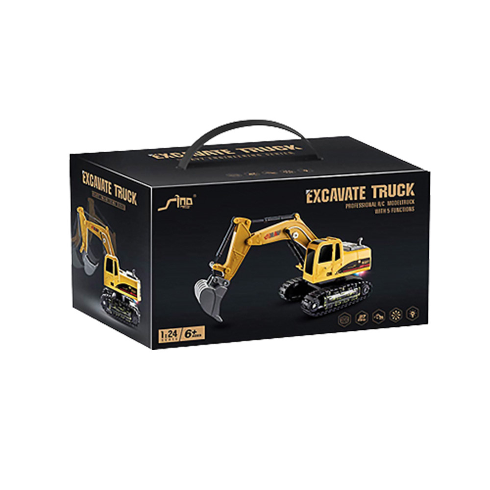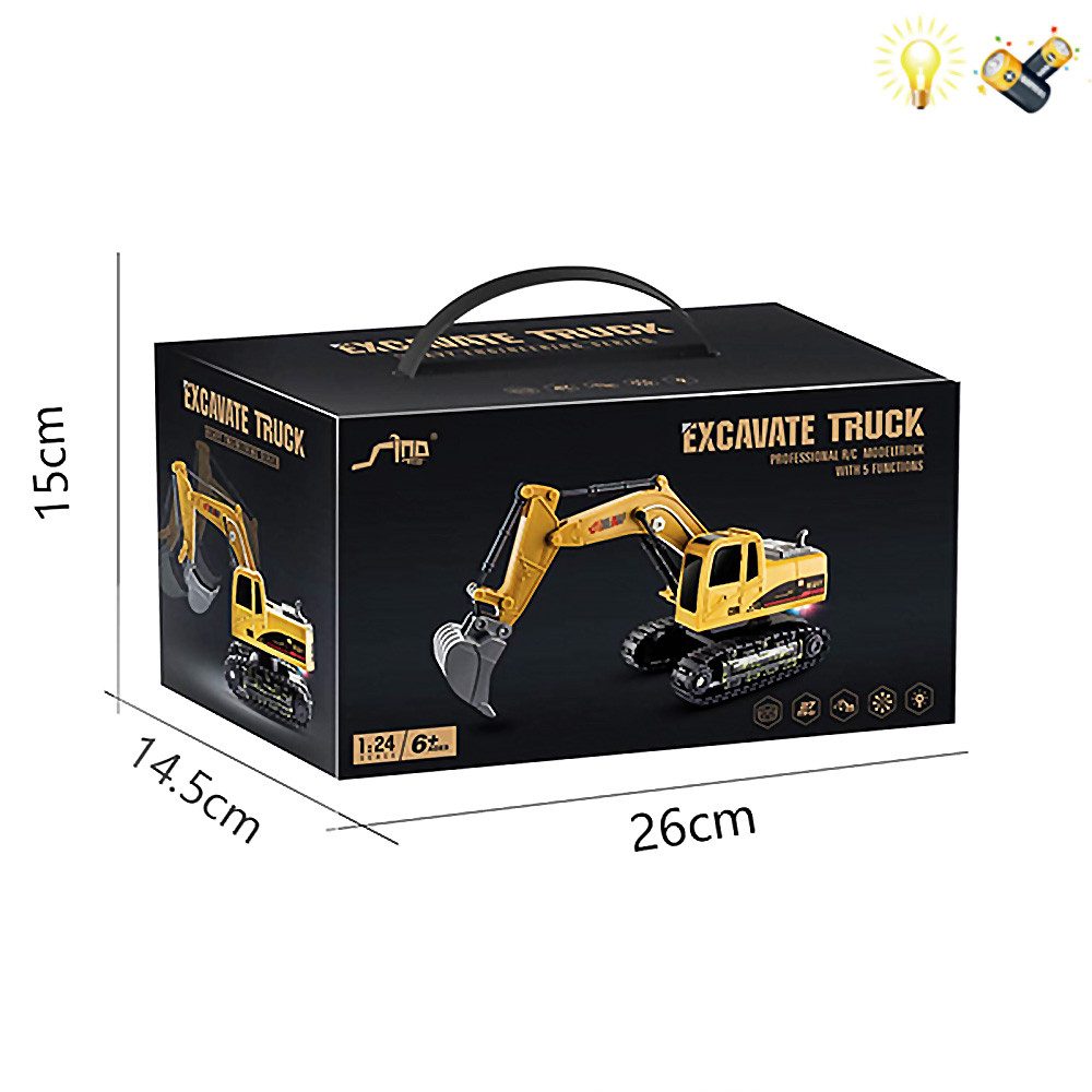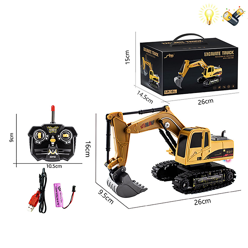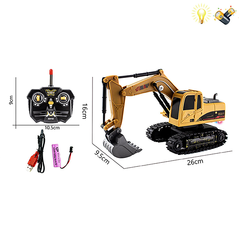 Комплектът съдържа: багер, дистанционно управление, зареждаща се батерия за багера, USB кабел за зареждане на батерията.