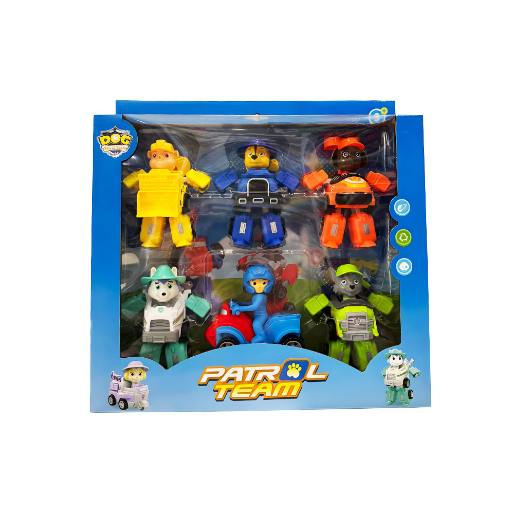 Комплектът съдържа 5 кученца и едно момченце в машини, трансформиращи се от робот в машина и обратно.
