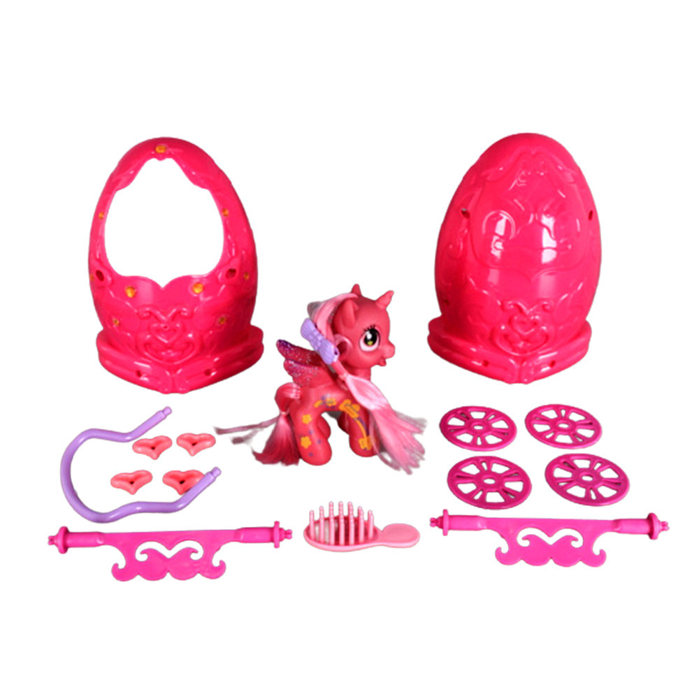 Комплектът съдържа пони, карета за сглобяване и гребенче за опашката и гривата на понито.