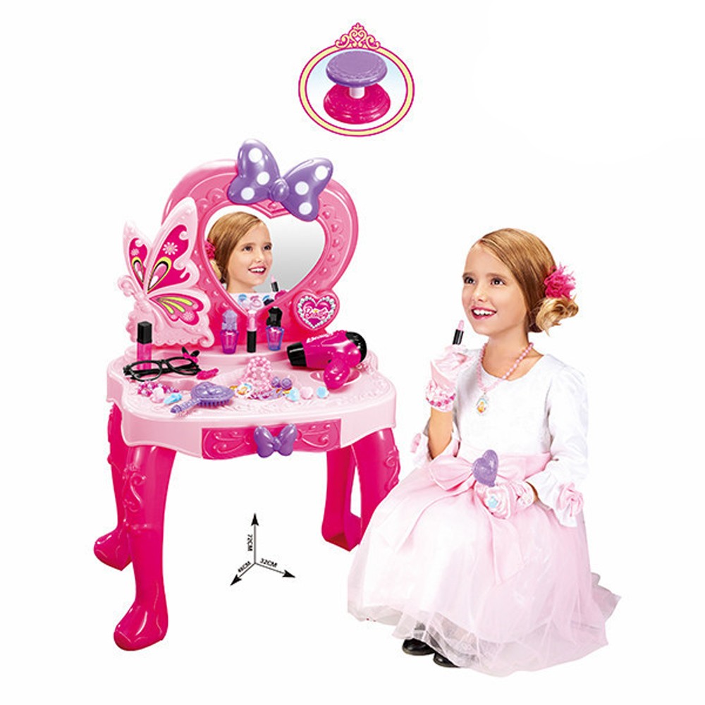 Комплектът съдържа тоалетна масичка, столче, сешоар с реална функция обдухване, гребенче, гривнички, колие, пръстенчета, обици, фибички, макети на червило, парфюми и очила.
