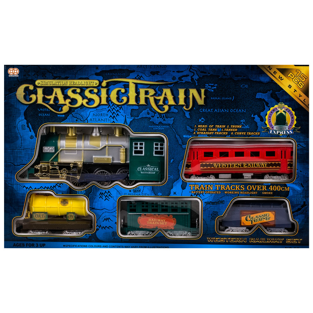 Комплектът съдържа 10 сглобяеми релси, локомотив, два пътнически вагона, един товарен вагон и един вагон-цистерна.