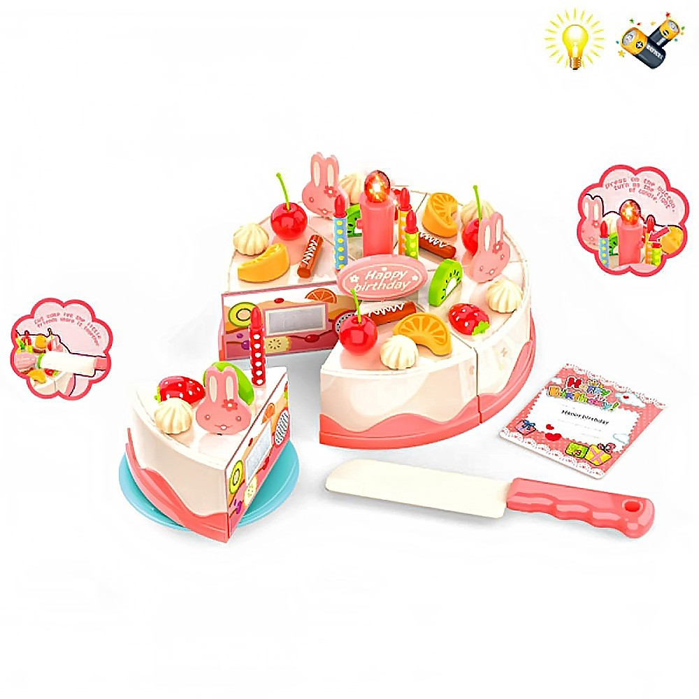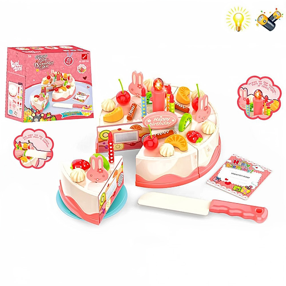 Комплектът съдържа макети на парчета торта, светеща голяма свещ, малки свещички, нож, чинийка и елементи за украса за тортата.