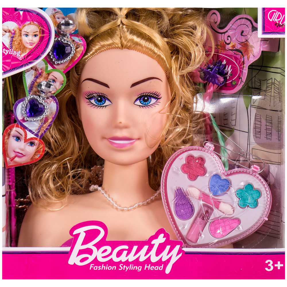 Комплектът съдържа бюст на кукла с височина 24 см, комплект гримове и аксесоари за правене на прически.
