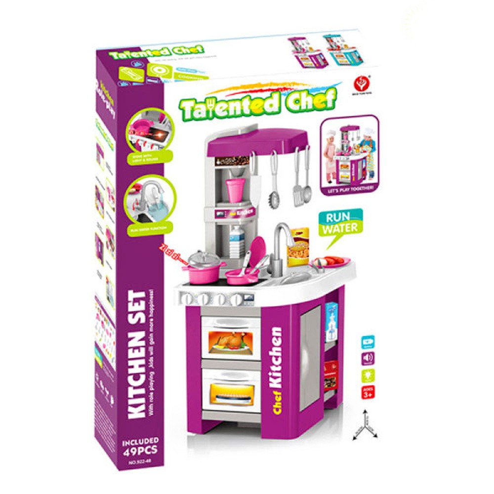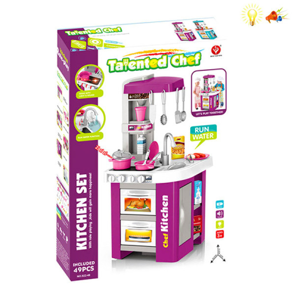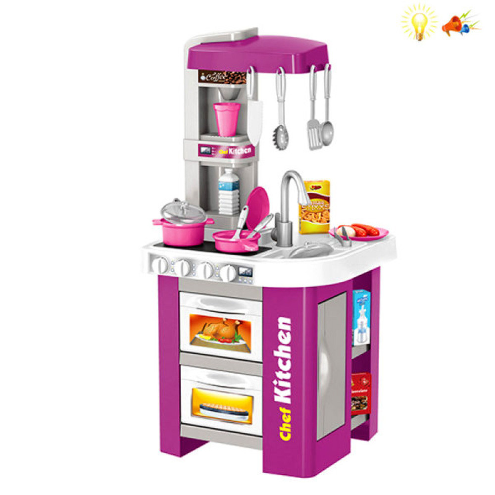 Функции: реална функция течаща вода от крана на мивката, светещи котлони, реалистични звуци на приготвяне на храна, отваряеми врати на фурната и хладилника.