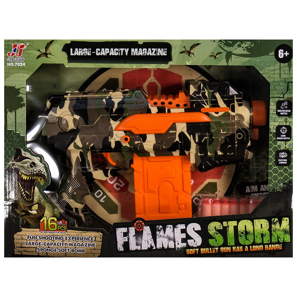 Комплектът съдържа автомат и 16 гумени стрели с вакуумни върхове.