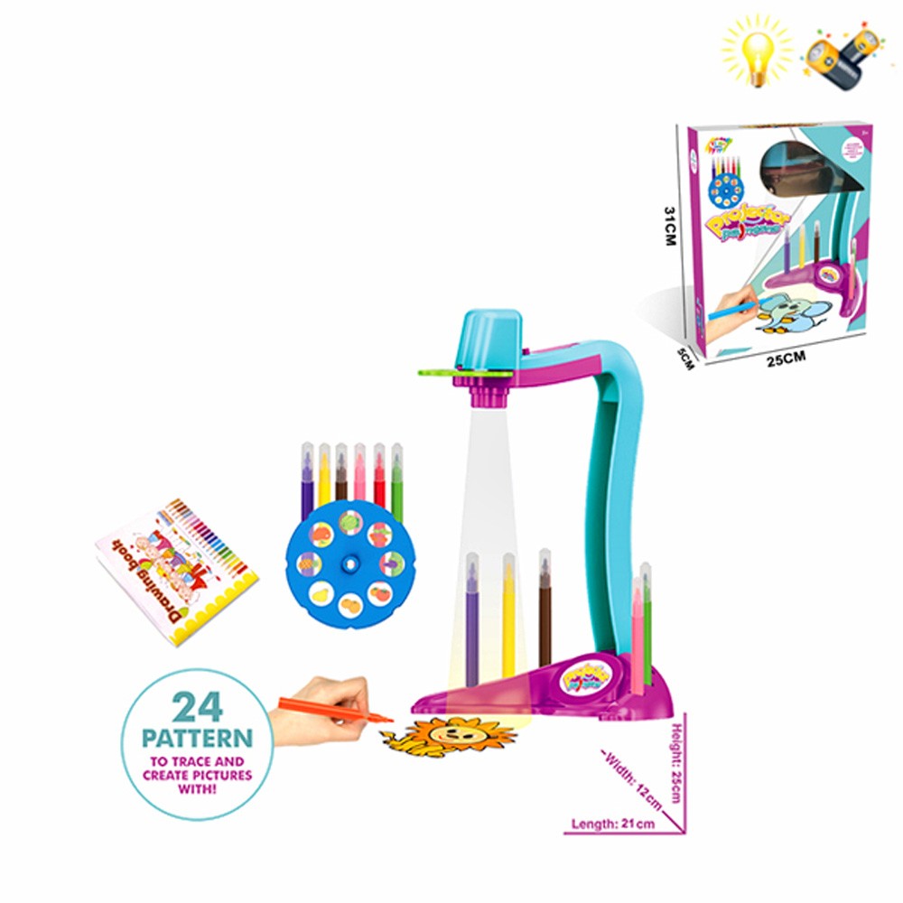 Комплектът съдържа проектор с лампичка, три диска с общо 24 картинки за прерисуване, 5 цветни флумастера и блокче с бели хартиени листи.