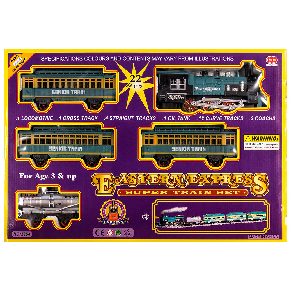 Комплектът съдържа локомотив, три пътнически вагона, един вагон-цистерна и релси с дължина 552 см.