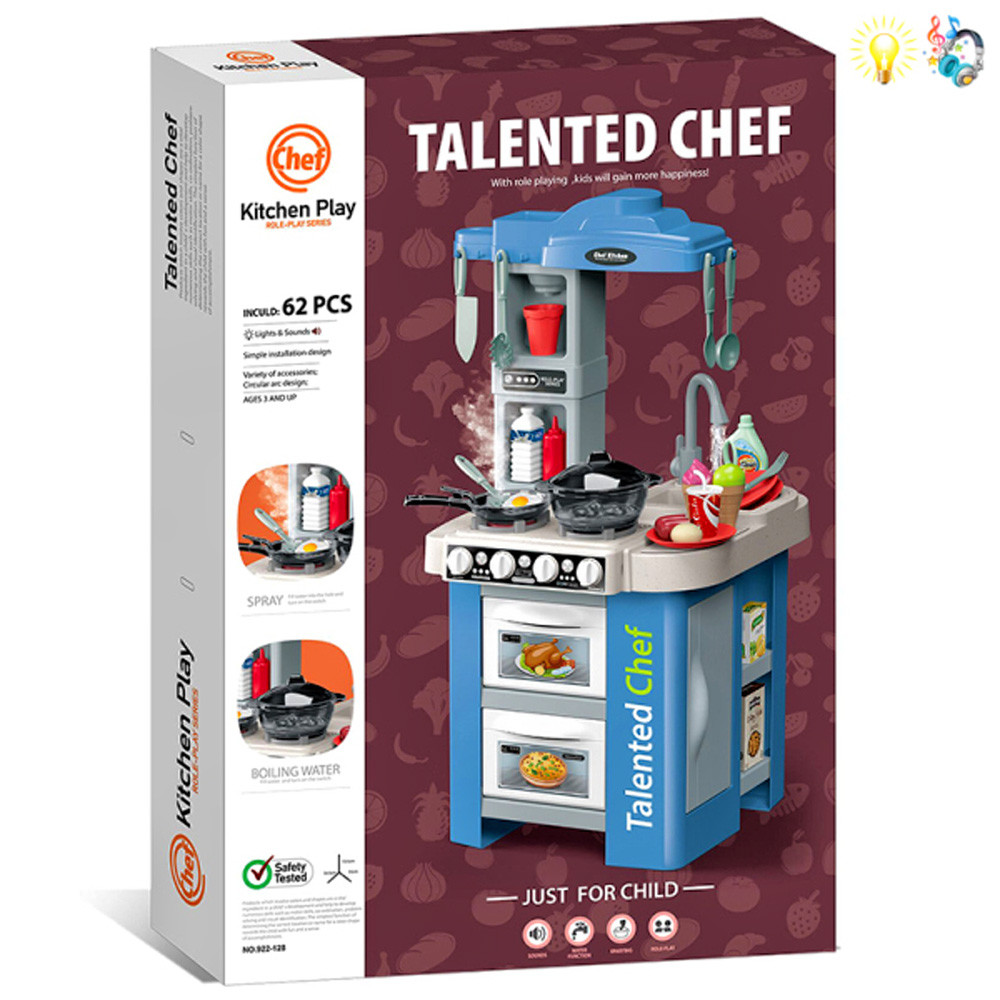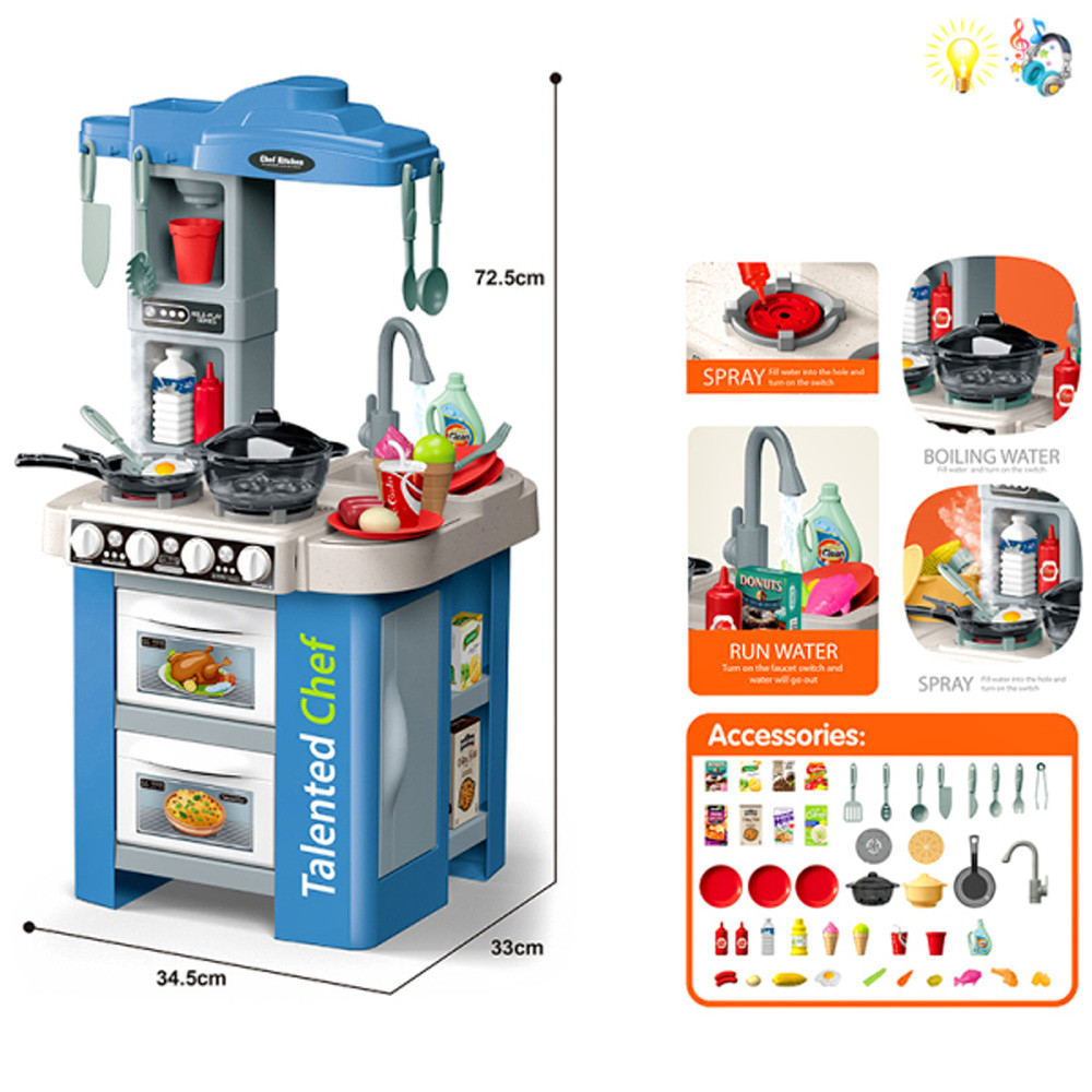 Функции: светлинни ефекти, реална функция течаща вода от крана на мивката, ляв котлон с механизъм за пара - парата не е гореща и е безопасна за деца!