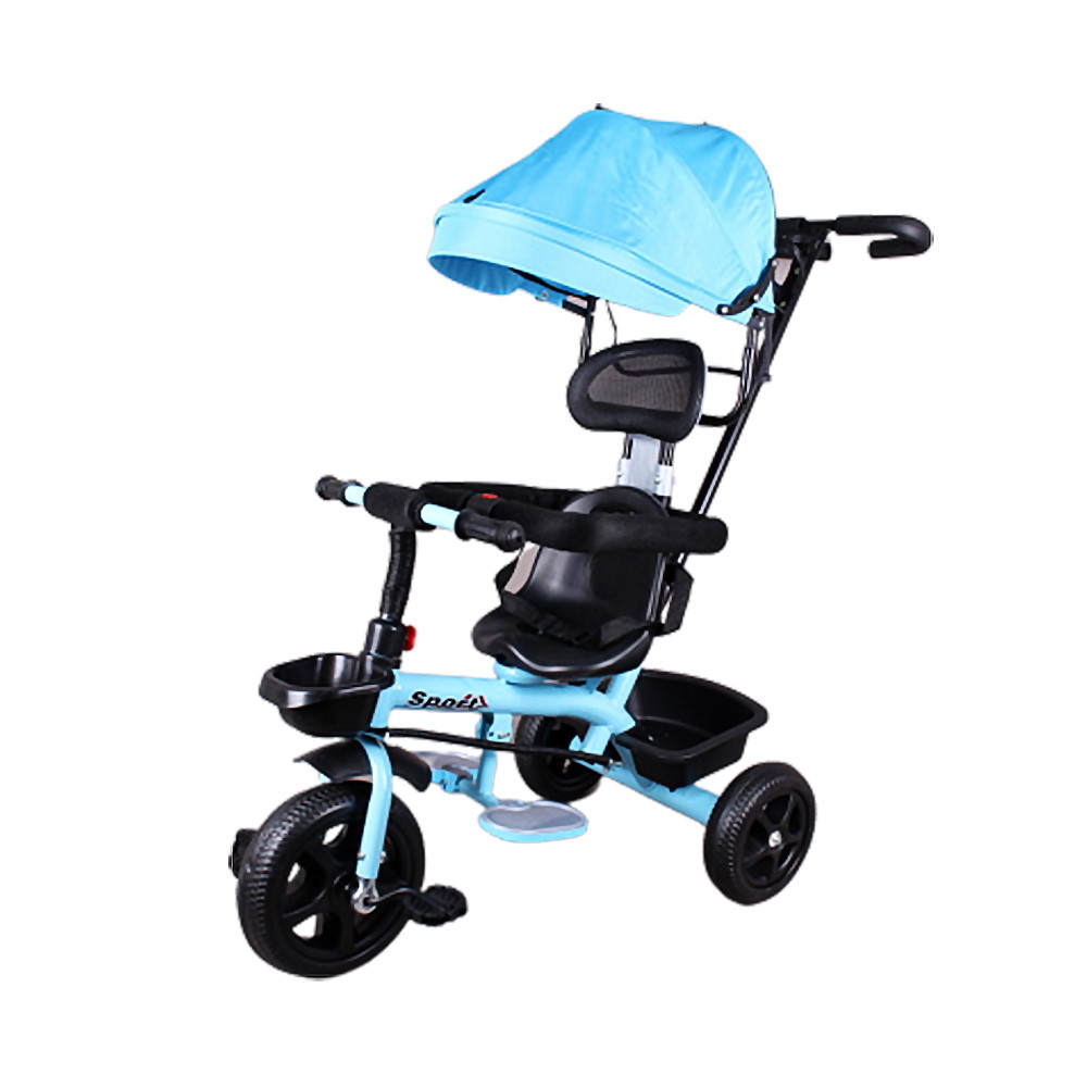 Колело триколка с метална конструкция, дръжка за родителски контрол и сенник.