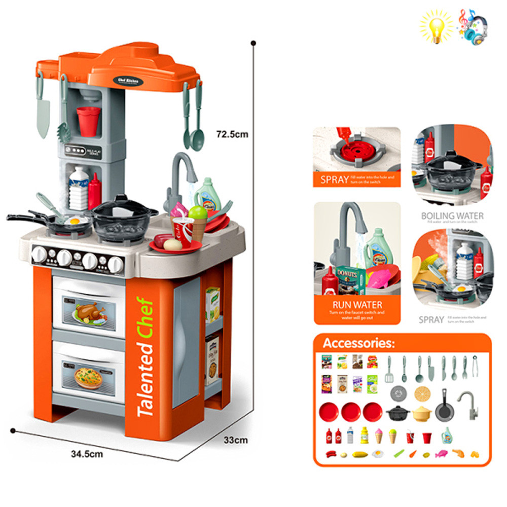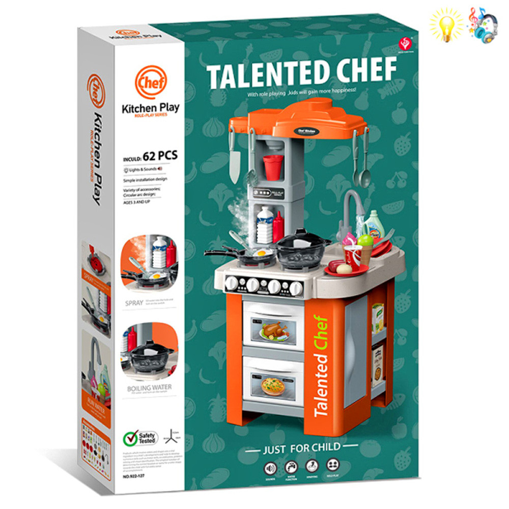 Функции: светлинни ефекти, реална функция течаща вода от крана на мивката, ляв котлон с механизъм за пара - парата не е гореща и е безопасна за деца!